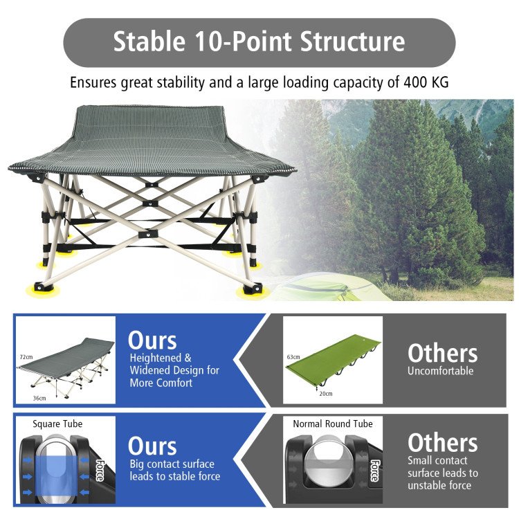 ● Stable Structure: The camping cot is designed with a 6-point stable structure and X-shaped support, ensuring excellent stability and large load-bearings of 882 lbs. Moreover, compared to normal round tubes, this cot adopts premium square tubes that provide big contact surfaces leading to stable force.