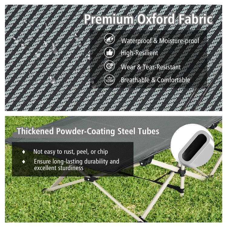 ● Comfy and Sturdy Material: Crafted with premium oxford fabric that is breathable, soft, and waterproof, the sleeping cot delivers a comfortable skin touch helping you get full relaxation while allowing for easy cleaning. Besides, the frame is supported by thickened powder-coated steel tubes for superior strength and excellent rust resistance.